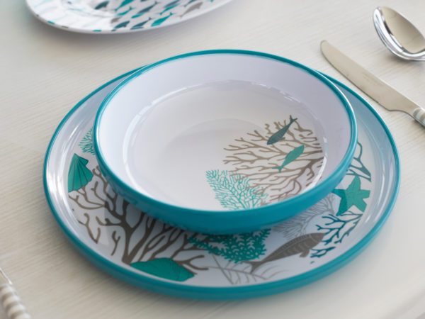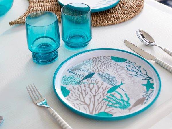 Questo servizio da tavola in melamina ha tutti gli accessori e si abbina anche alla cristalleria sintetica Bahamas o alla collezione Moon, entrambe con brocche e bicchieri in diverse tonalità.