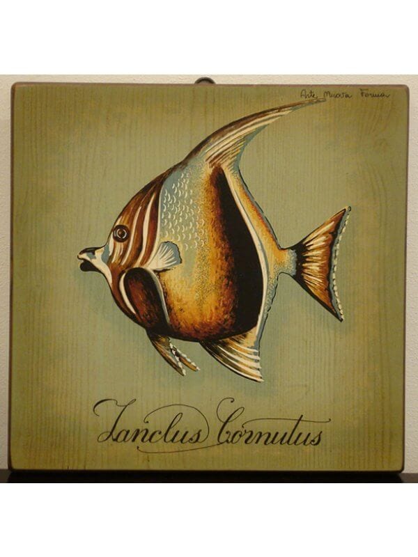Quadretto su tavoletta di legno con pesce.