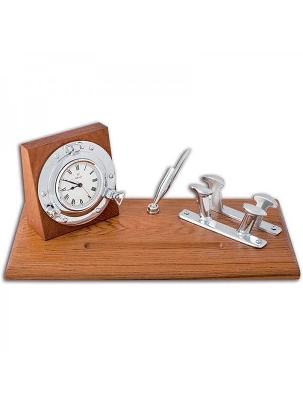 Soprammobile elegante da scrivania con orologio, portalettere e portapenna in ottone cromato su base in legno TEAK.Dimensioni 380 x 180 mm