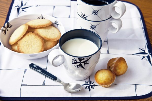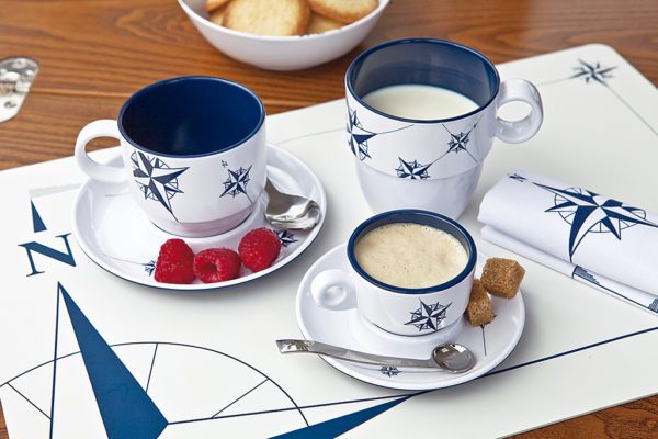 La tazza mug antiscivolo NORTHWIND, è ideale per la colazione e il tè. Questa tazza di melamina infrangibile di colore bianco, ha una rosa dei venti disegnata di colore blu.