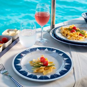 La collezione Pacific è pensata per gli amanti della nautica dal gusto classico ed elegante. Il design della rosa dei venti nei toni del beige, del blu navy e del bianco rendono questo servizio da tavola in melamina un elemento essenziale per vestire la tavola con eleganza.